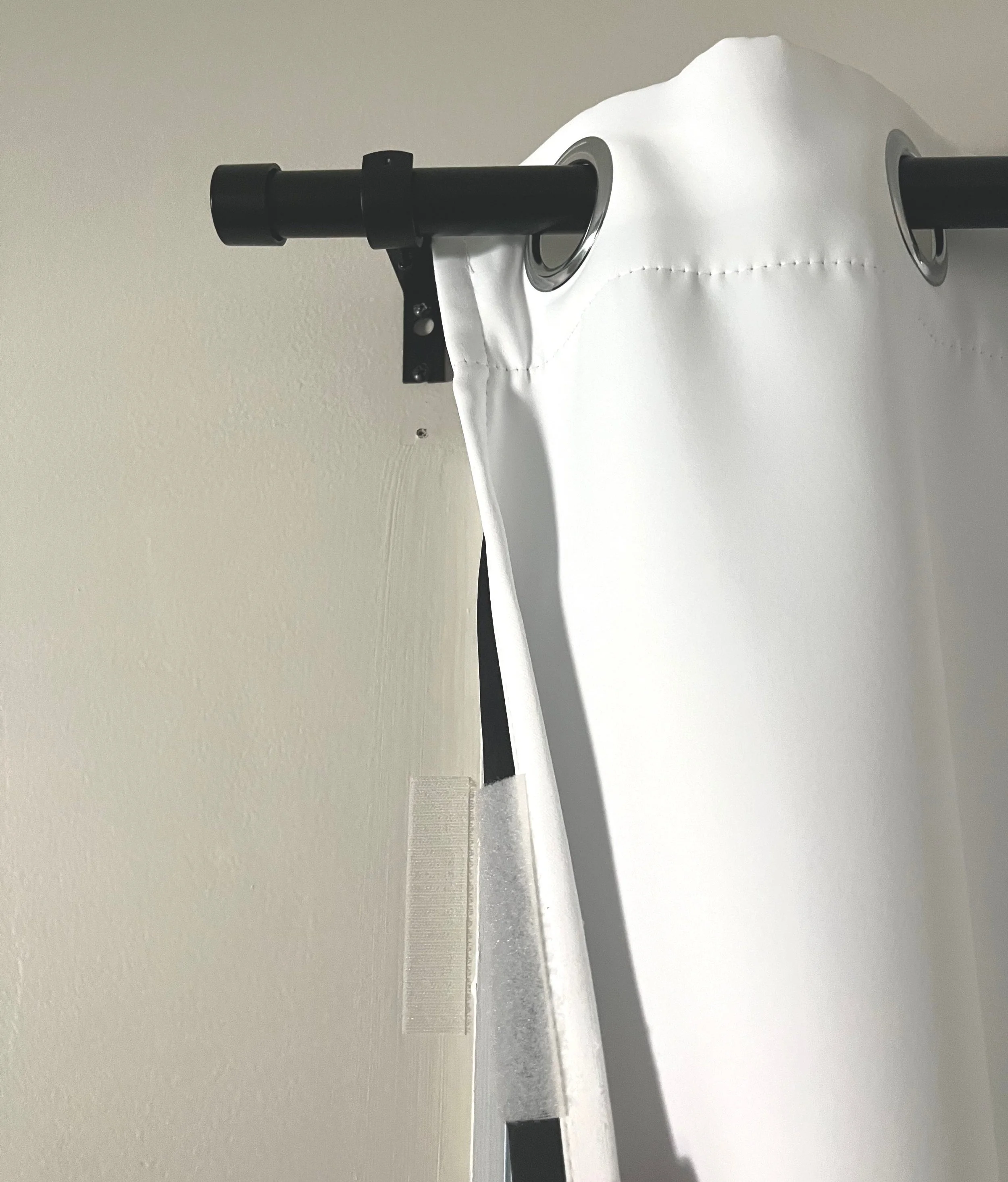 You also don’t want any light shining out the sides of the curtains. I stick pieces of velcro (these are already cut for you) along the window and place those pieces with the other side of the Velcro at the matching location inside of the curtains. I can pull the curtain off the velcro to let the sun in the room and re-apply for each nap whenever I want to.